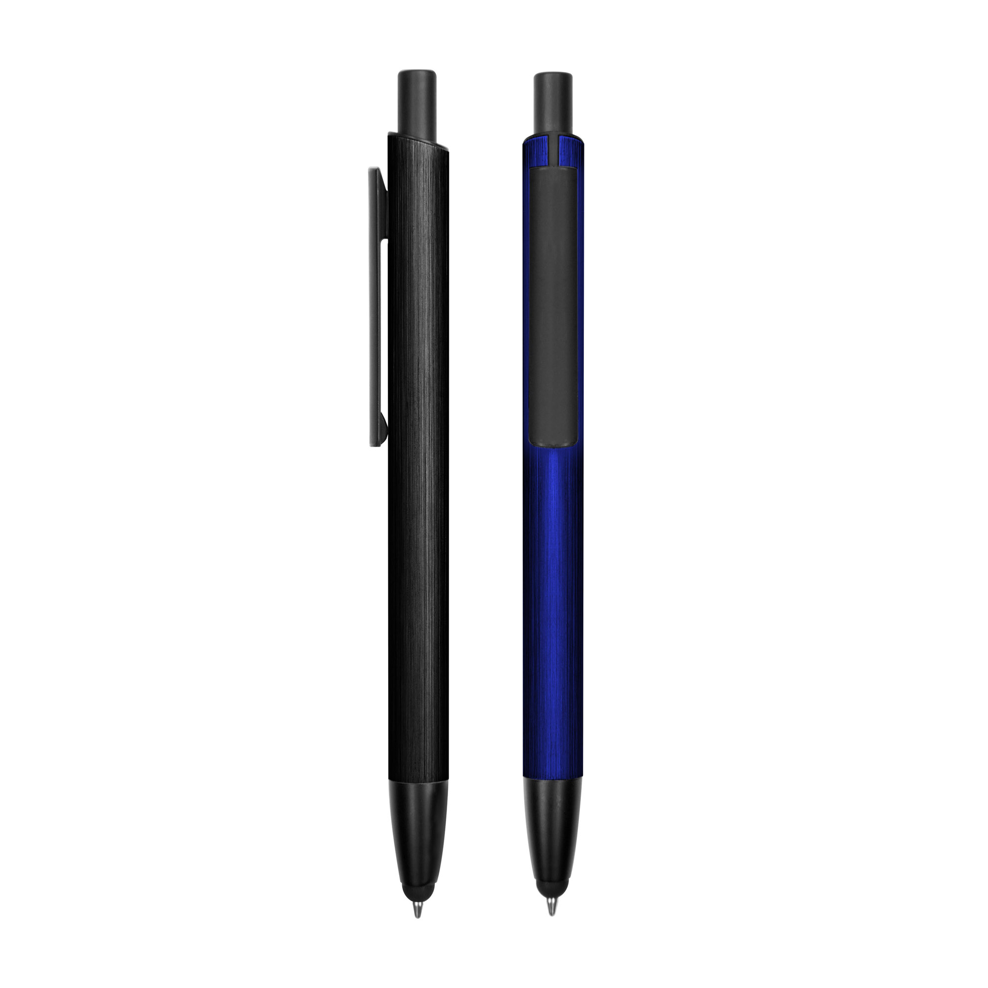 Aluminio. Cuerpo metálico. Clip, puntera y pulsador plástico. Puntera touch. Tinta negra.