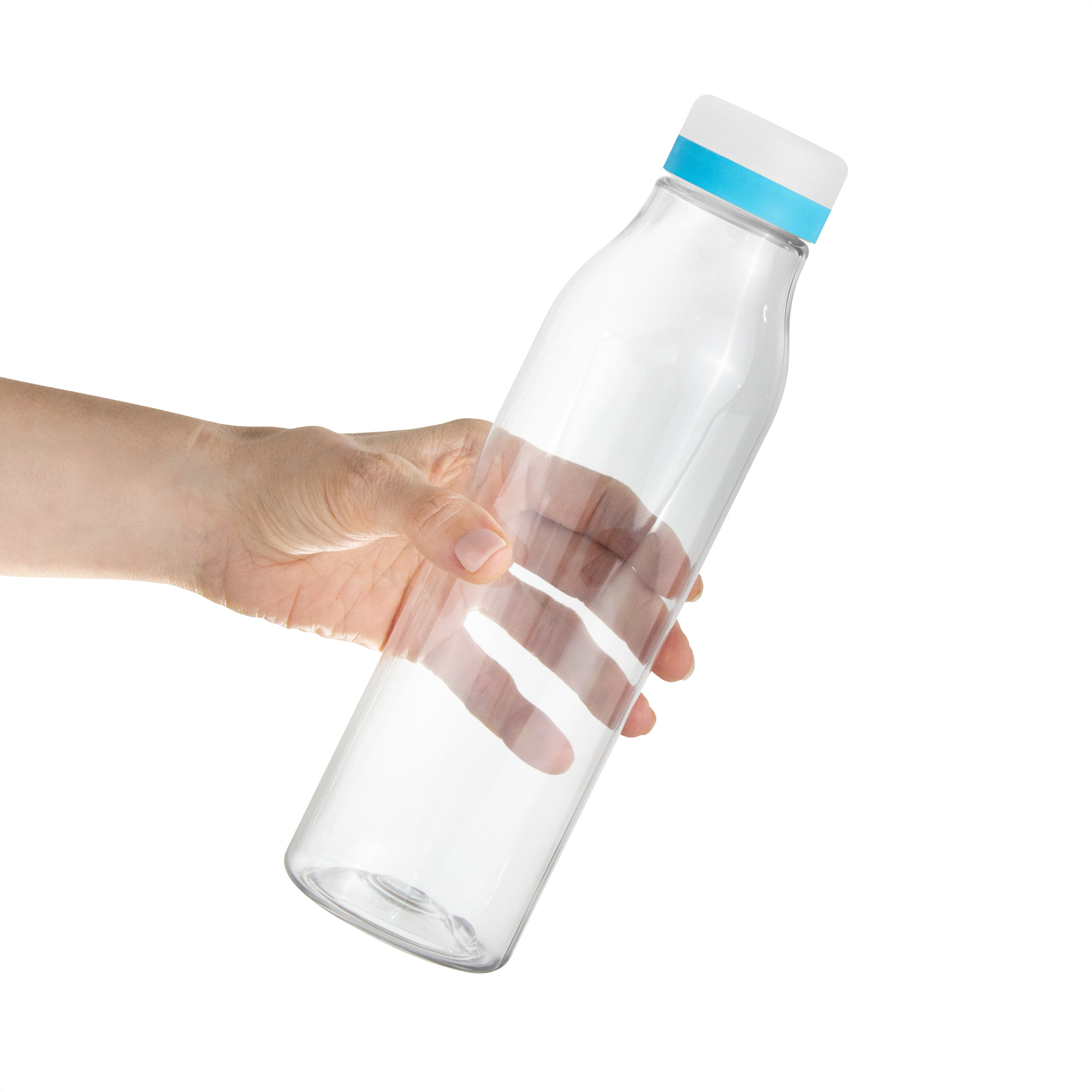 Botella de plástico transparente con tapa a rosca esmerilada con anillo de silicona de diferentes colores.