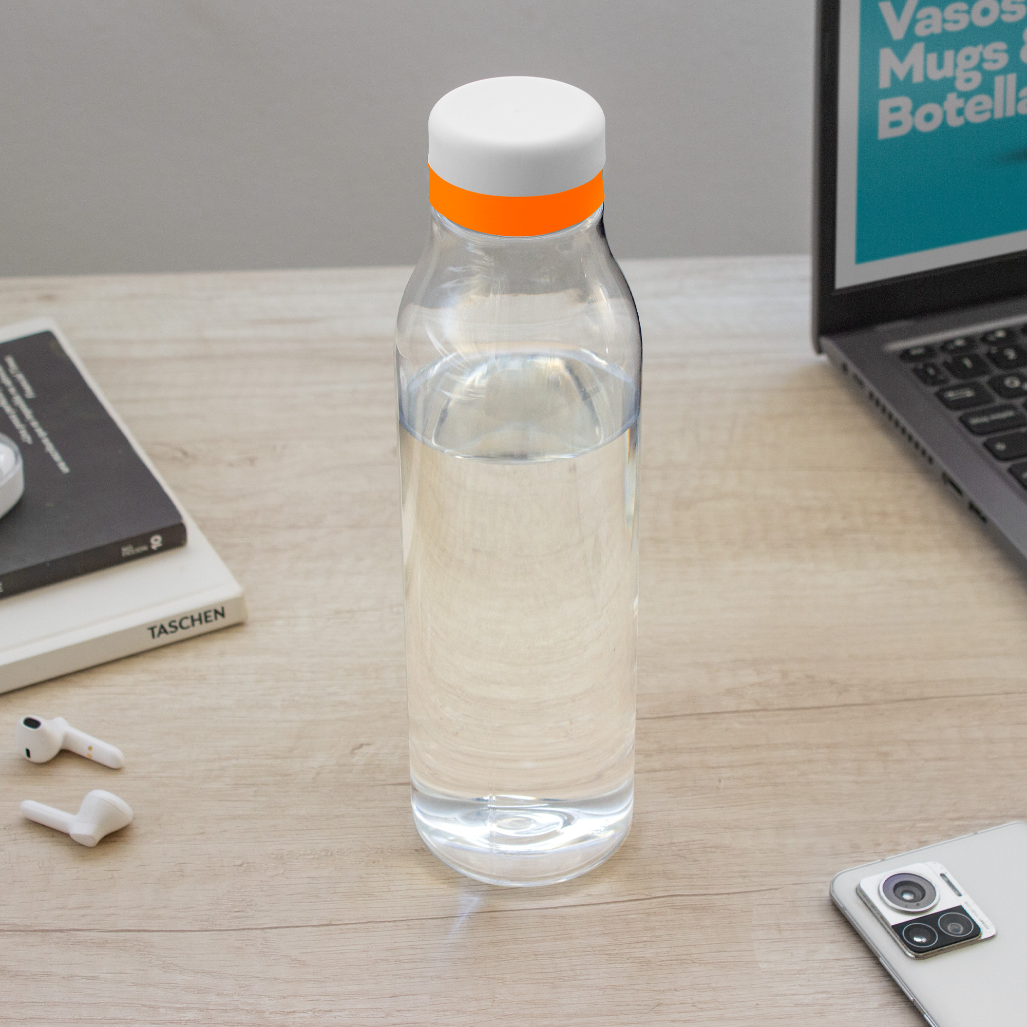 Botella de plástico transparente con tapa a rosca color blanco mate con anillo de silicona de diferentes colores.